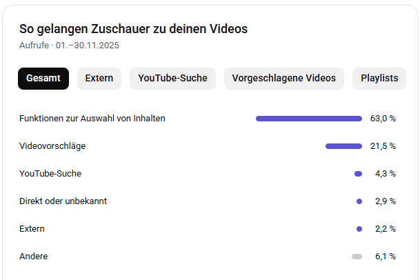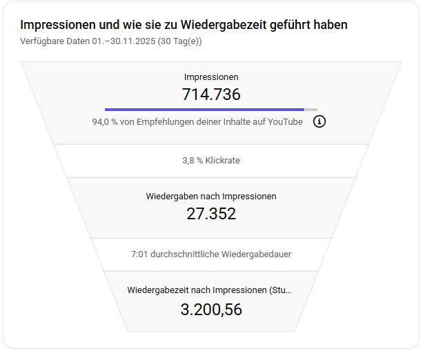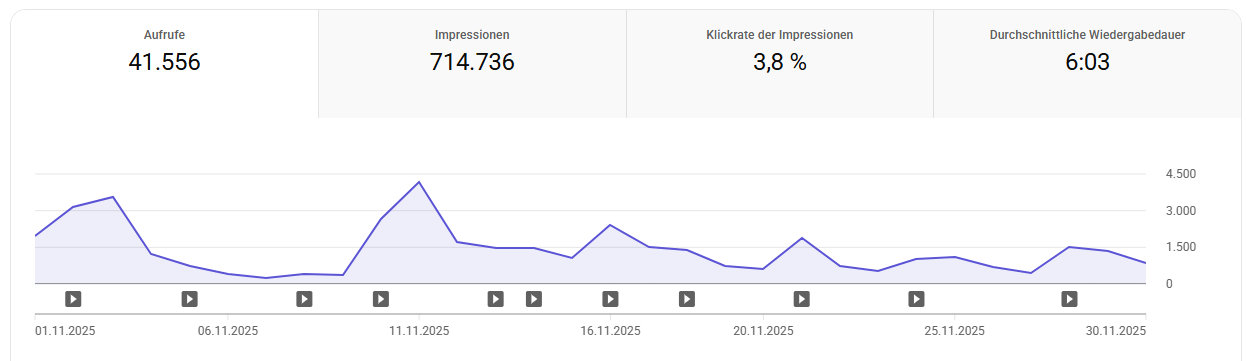 Neben meinen Statistikberichten zur PV-Anlage und der Wärmepumpe hatte ich mich dazu entschlossen, regelmäßig auch über die Entwicklung meines YouTube Kanals zu berichten. Der November ist nun der erste volle Monat, seitdem der Kanal online ist. Mal schauen, wie sich die nächsten Monate entwickeln. Wahrscheinlich kann es nicht so rasant weitergehen, wie in den letzten Wochen.