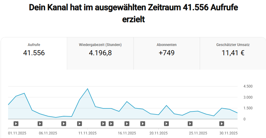 Im November habe ich 749 Abonnenten dazu gewonnen. Es gab 41.556 Aufrufe und eine Wiedergabezeit von ca. 4.197 Stunden. Der Umsatz ist noch nicht sehr aussagekräftig und betrug im November gut 11€.
