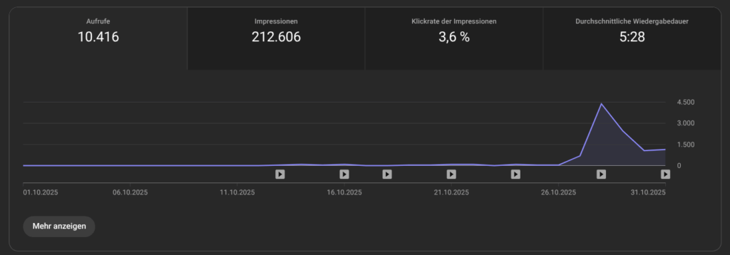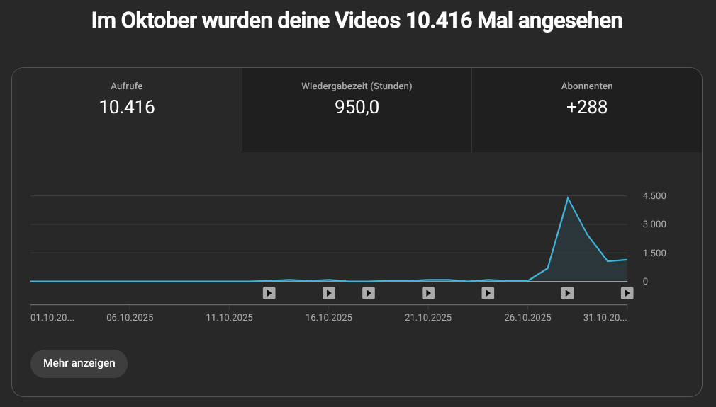 Mal schauen, ob ich den guten Start und den damit verbundenen Erwartungen auch im November gerecht werden kann. Ich habe jedenfalls aktuell noch viele Ideen für entsprechende Videos. Wir sehen uns dann auf YouTube oder natürlich weiterhin auch hier auf dem Blog.