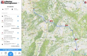 Interessanterweise kommt man dann auf einmal auch mit nur 2 Ladestopps aus. Wenn man also selbst ein paar Parameter im Routenplaner verändert und andere Stationen auswählt, kommt man durchaus auf ähnlich gute oder sogar noch bessere Ergebnisse. Auch die Gesamtzeit hat sich dadurch quasi nicht verändert. Mit der auf 40 Minuten verlängerten Mittagspause wird dann auch wieder unsere ursprüngliche Strecke ausgewählt.