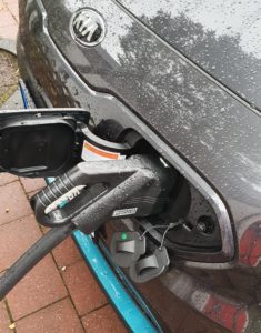 Nun muß nur die Klappe der Paketbox geöffnet, der Stecker vom Haken entfernt und das Kabel heraus gezogen werden. Die Box kann dann wieder geschlossen werden und das E-Auto kann geladen werden. Damit keiner über das Kabel stolpert, wird einfach unsere Fußmatte darüber gelegt.