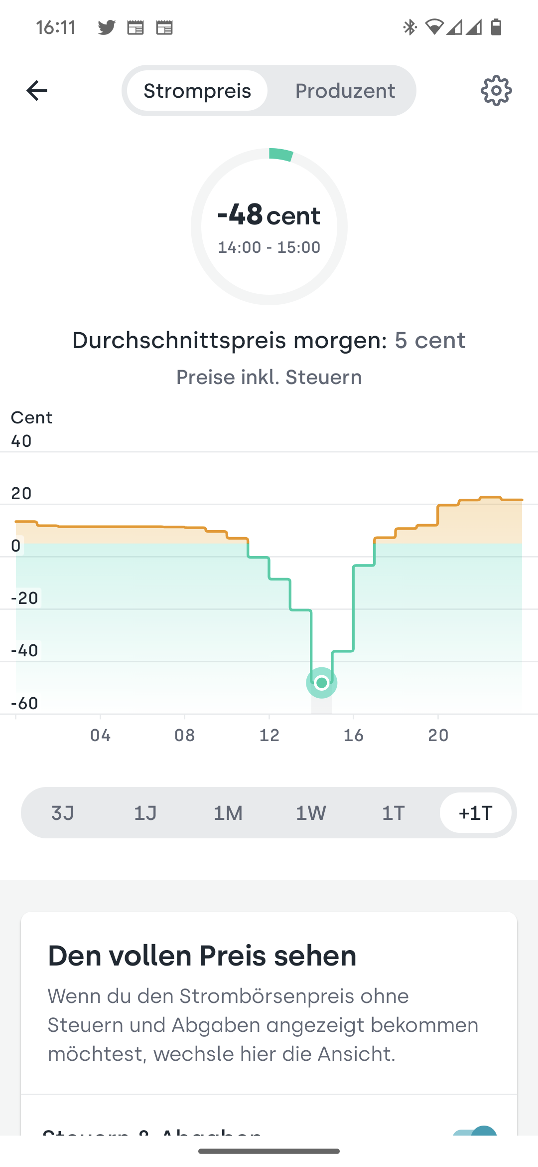 Gestern habe ich nicht schlecht gestaunt, als die Preise für heute verfügbar waren. Zwischen 14:00 und 15:00 Uhr lag der Strompreis bei -0,48€ inkl. Steuern und Abgaben. Lediglich die monatlichen Grundgebühren müssen noch hinzu gerechnet werden.
