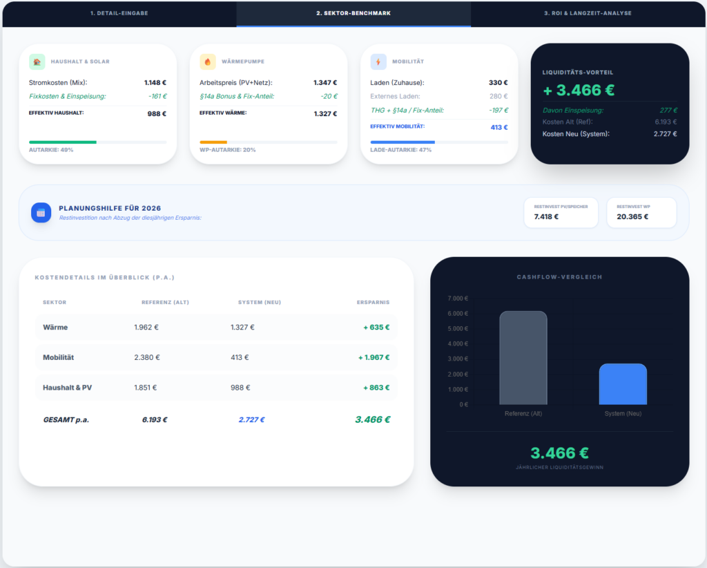 Wie viel spart eine Wärmepumpe wirklich, wenn sie mit PV-Strom läuft? Lohnt sich der Speicher für das E-Auto?“ Mein Sektoren-Dashboard liefert die Antworten. Dieses Tool berechnet nicht nur isolierte Werte, sondern betrachtet dein Haus als energetisches Gesamtsystem