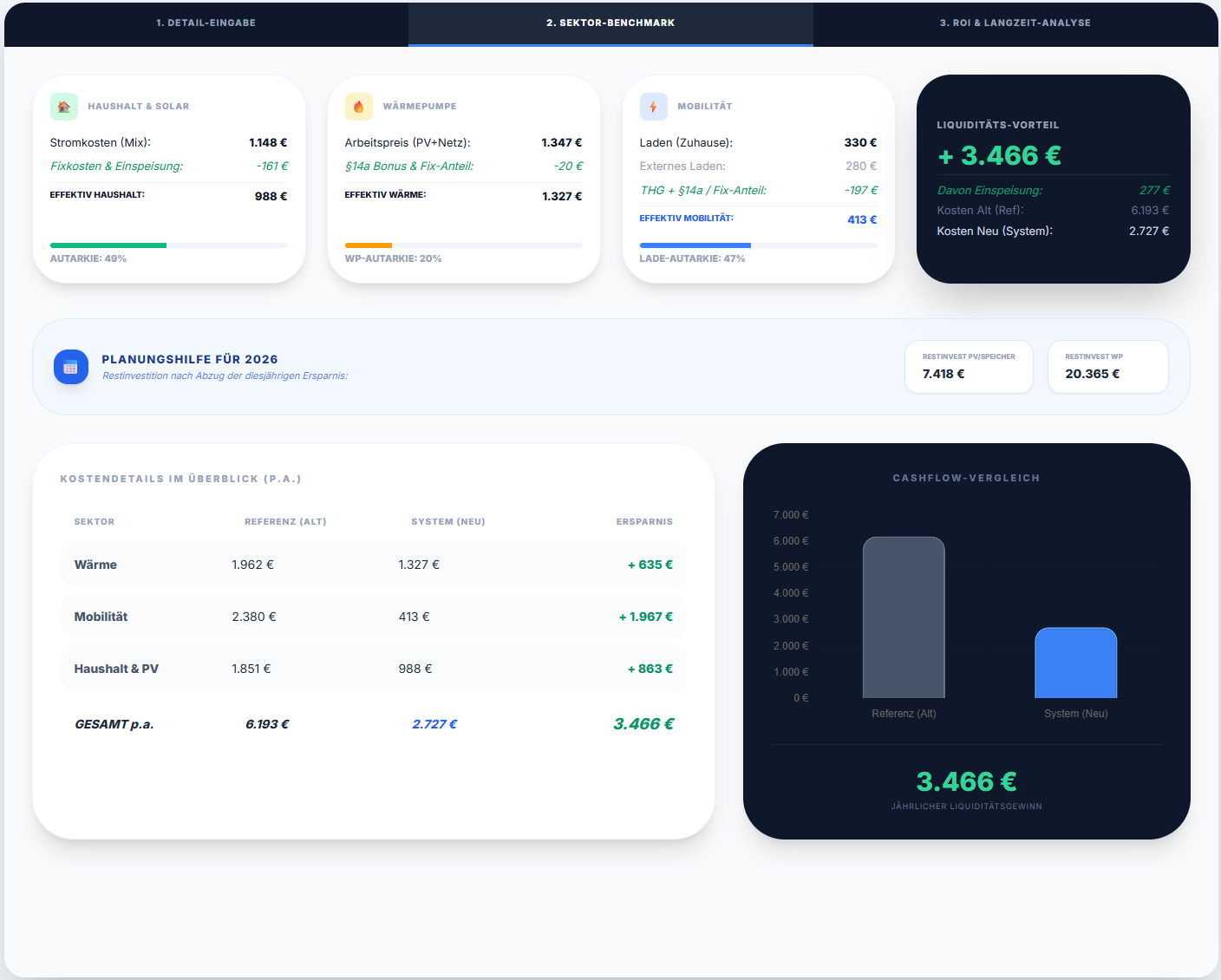 - Kosten Neu (System): Deine tatsächlichen Ausgaben inklusive Wartung und PV-Gestehungskosten.