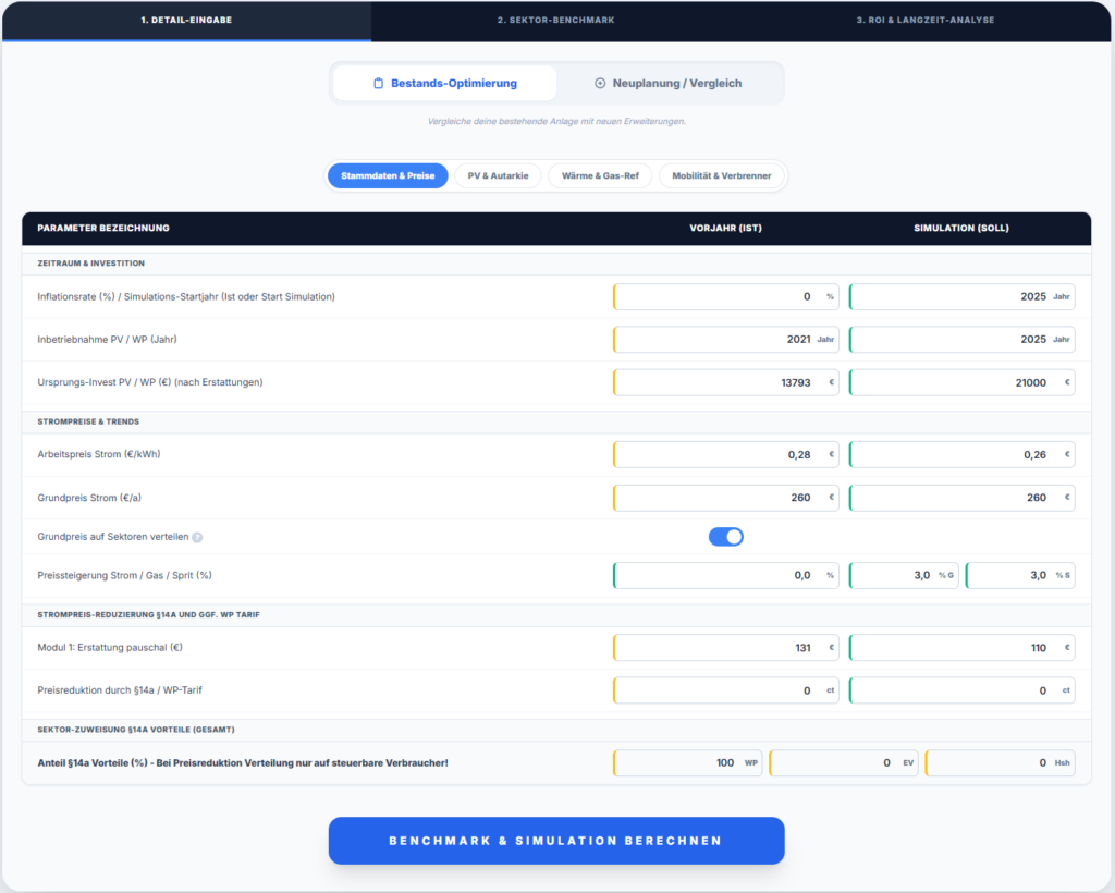 - Modus-Wahl: Wähle „Bestand“, um deine aktuelle Situation zu optimieren. Wähle „Planung“, wenn du den kompletten Umstieg (z.B. von Gas auf Wärmepumpe) simulieren möchtest.