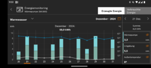 Wie oben bereits erwähnt, hatte ich die Wärmepumpe zu Beginn des Monats noch nicht richtig in das Sunny Portal eingebunden. Daher werden gerade die Tage mit den hohen Verbräuchen des Heizstabes nicht richtig angezeigt. Erst am 6. Januar hatte ich den entsprechenden Code angepasst. Ab dem 8. Januar lief die Wärmepumpe dann ohne den Heizstab.