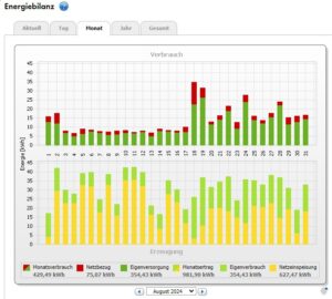 Im Juli hatten wir nur wenige schlechte Tage. Die Erträge an den guten Tagen sind zwar nicht mehr an die Spitzenwerte heran gekommen, wie sie noch im Juli erzeugt wurden, aber insgesamt hatten wir relativ duchgängig recht gute Tage. Der Gesamtertrag lag im Juli bei 1.058kWh. Beim Verbrauch gab es keine Besonderheiten. Lediglich am Ende des Monats habe ich auch meinen Kia EV6 zu Hause geladen, was für entsprechende Ausschläge sorgt.