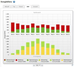 In 2020 hatten wir einen Eigenverbrauch von 194 kWh und eine Einspeisemenge von 72 kWh. Der Verbrauch lag seit Inbetriebname bei 1.200 kWh. Der Ertrag betrug 402 kWh.