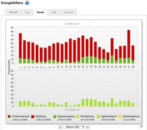 Wie bereits kurz erwähnt, sind die PV-Erträge im Februar wieder etwas angestiegen. Allerdings bewegen wir uns hier immer noch im niedrigen Bereich.