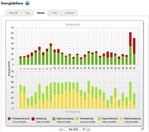 Auf Grund des geringen Wärmebedarfs im Mai und dem guten PV-Ertrag, konnte der Strom für die Wärmepumpe zu ca. 73% mit Sonnenenergie gedeckt werden.