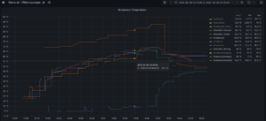 Zunächst werfen wir wieder einen Blick auf die Wetterdaten im Mai. Hierzu nutze ich die Klimadatenseite von Michael Theusner. Nachfolgend habe ich den Temperaturverlauf sowie die Luftfeuchtigkeit für den Mai 2025 dargestellt. Die Luftfeuchtigkeit spielt bei den Temperaturen eigentlich keine große Rolle mehr. Abtauvorgänge sind auch bei kalten Temperaturen im Mai nicht mehr zu erwarten.