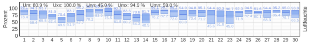 Zunächst werfen wir wieder einen Blick auf die Wetterdaten. Hierzu nutze ich die Klimadatenseite von Michael Theusner. Nachfolgend habe ich den Temperaturverlauf sowie die Luftfeuchtigkeit für den Novmber 2025 dargestellt. Die Luftfeuchtigkeit macht sich – gerade bei den Temperaturen unterhalb von ca. 5-6 Grad nun deutlich bemerkbar. Die Vereisung der Wärmepumpe nimmt zu und die Abtauvorgänge unterbrechen kurzfristig den Heizbetrieb.