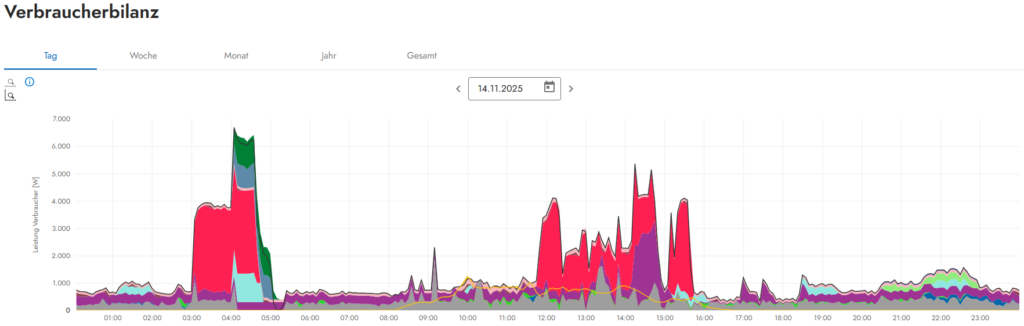 Am wärmsten Tag ist die Wärmepumpe auf niedrigem Niveau gelaufen. Die hohen Verbraucher an dem Tag waren die E-Autos.