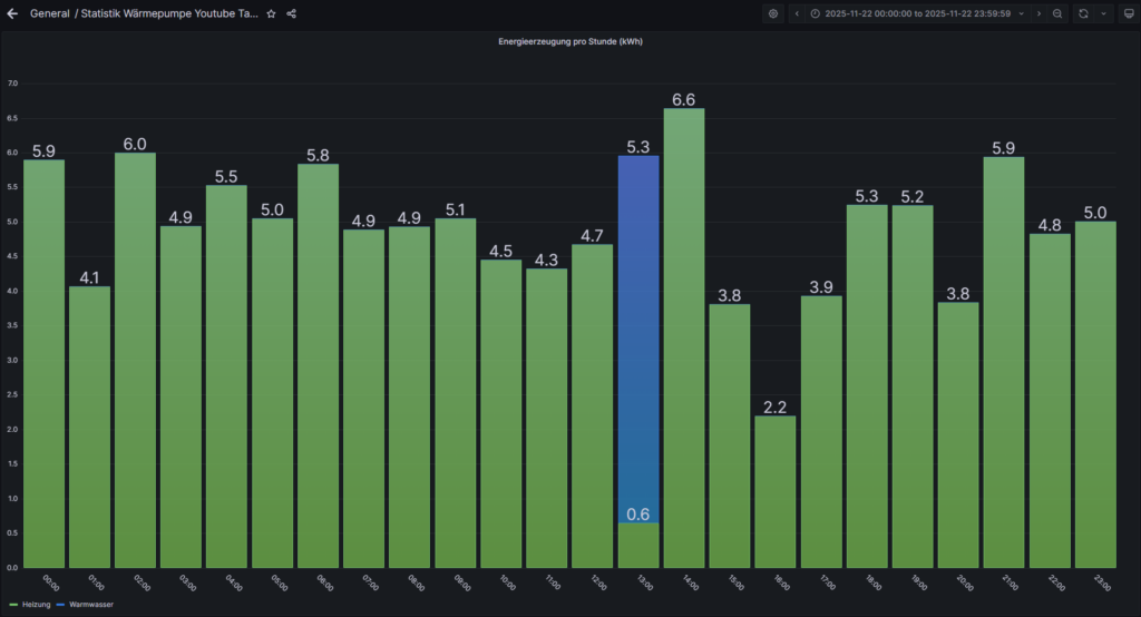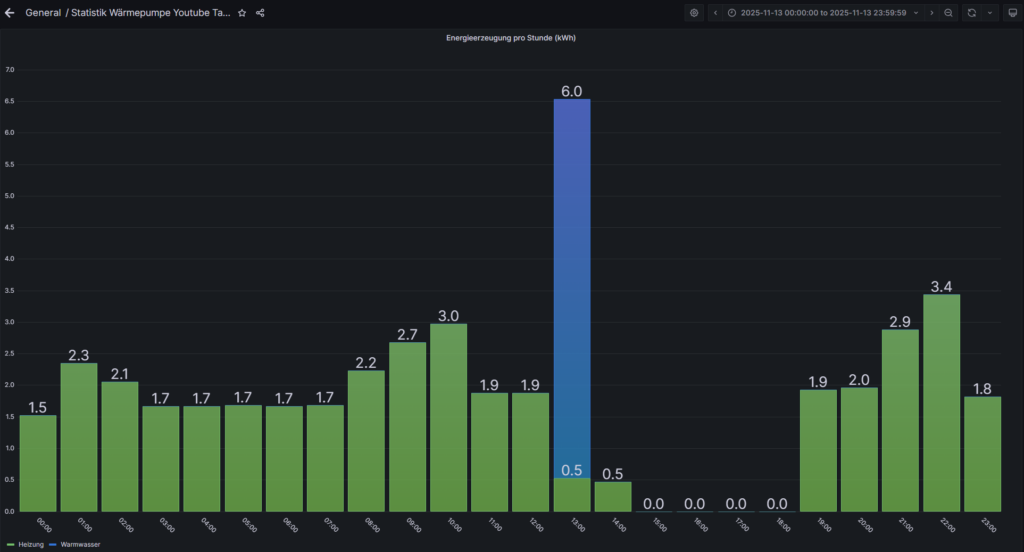 Die nachfolgende Grafik zeigt die stündliche Wärmeerzeugung am kältesten Tag im November. Die höhere Wärmeerzeugung nach der Warmwasseraufbereitung kommt daher, weil das System versucht, die verlorene Heizleistung wieder aufzuholen.