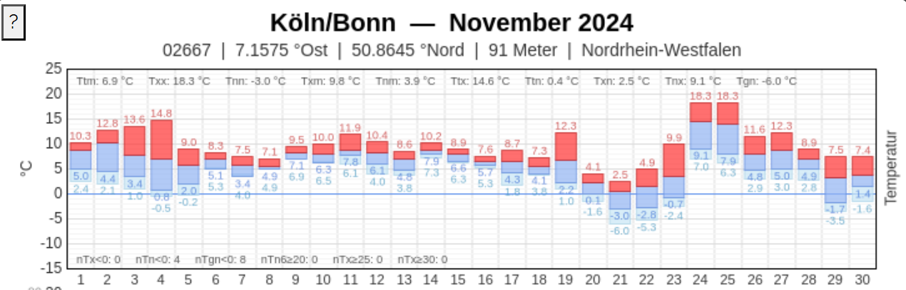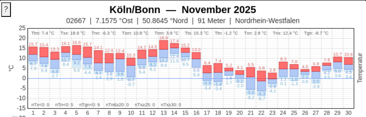 Die Durchschnitts-Temperatur im November letzten Jahres lag mit etwa 7°C leicht unter diesem Jahr. Die Temperaturen waren allerdings relativ gleichmäßig und es gab nicht so viele sehr kalte Tage. Leider hatte ich für diesen Zeitraum keine Protokollierungen mehr von meiner Gasheizung. Da die Gasrechnung aus dem Vorjahr auch keinen dedizierten Wert für November enthält muß dieser Vergleich dieses mal entfallen.