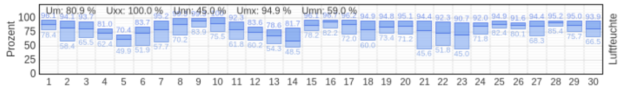 Im Schnitt hatten wir eine Temperatur noch 7,4 Grad Celsius im November. In der zweiten Hälfte lag der Tagesschnitt dann regelmäßig unter 5 Grad. Die Luftfeuchtigkeit lag bei etwa 81%.