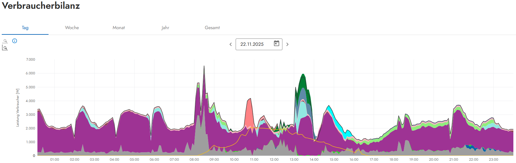 Am wärmsten Tag ist die Wärmepumpe auf niedrigem Niveau gelaufen. Die hohen Verbraucher an dem Tag waren die E-Autos.
