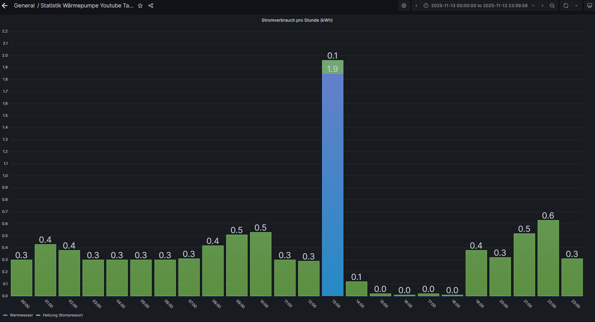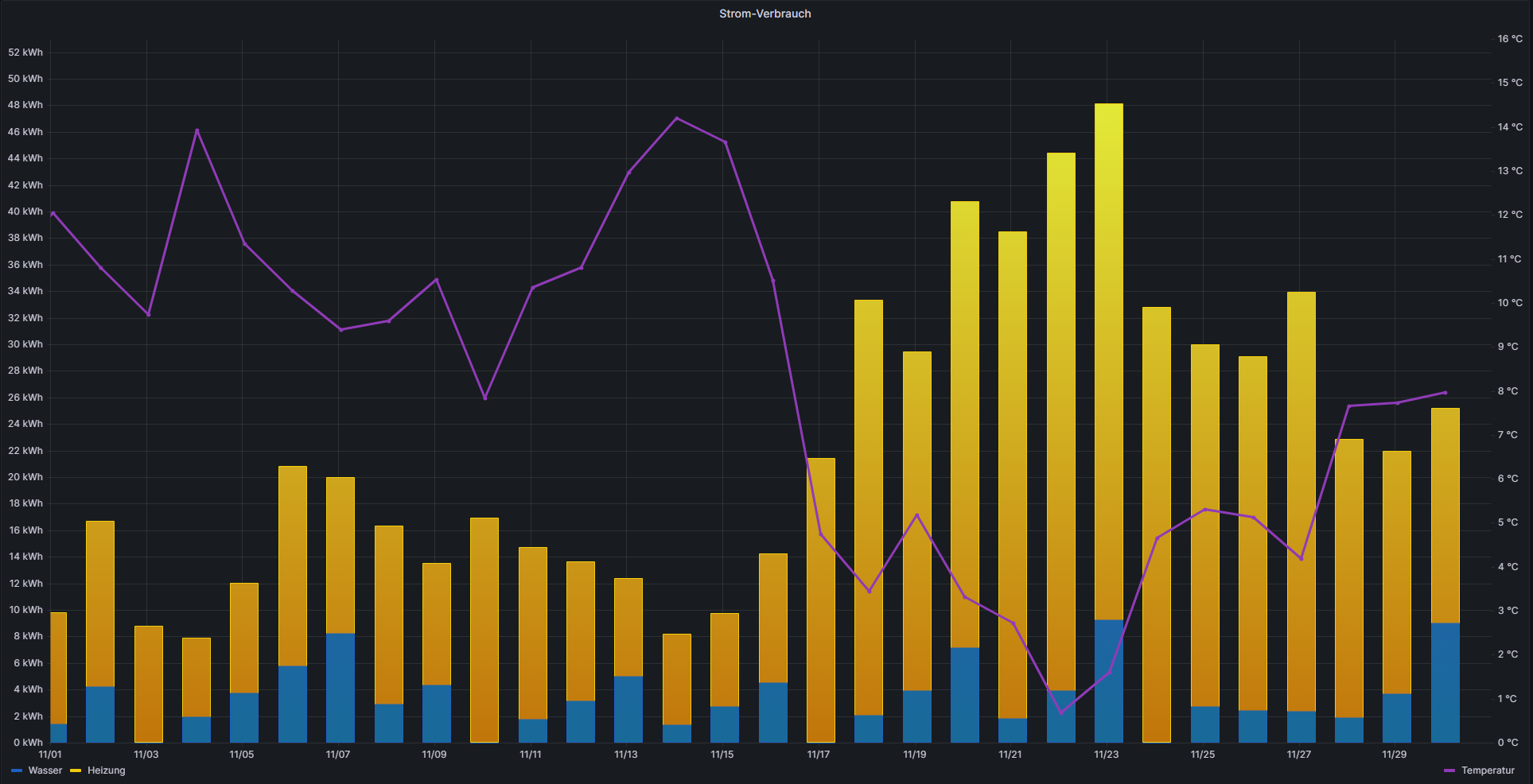Im November hatten wir quasi zwei Temperaturbereiche. In den ersten beiden Wochen war es noch relativ mild aber in den letzten beiden Wochen wurde es dann deutlich kälter. Daher ist auch der Verbrauch der Wärmepumpe gegenüber dem Oktober deutlich gestiegen.